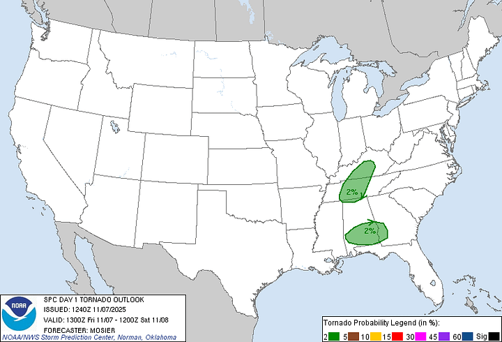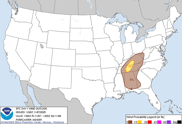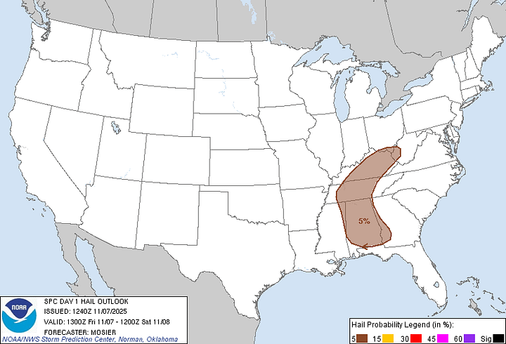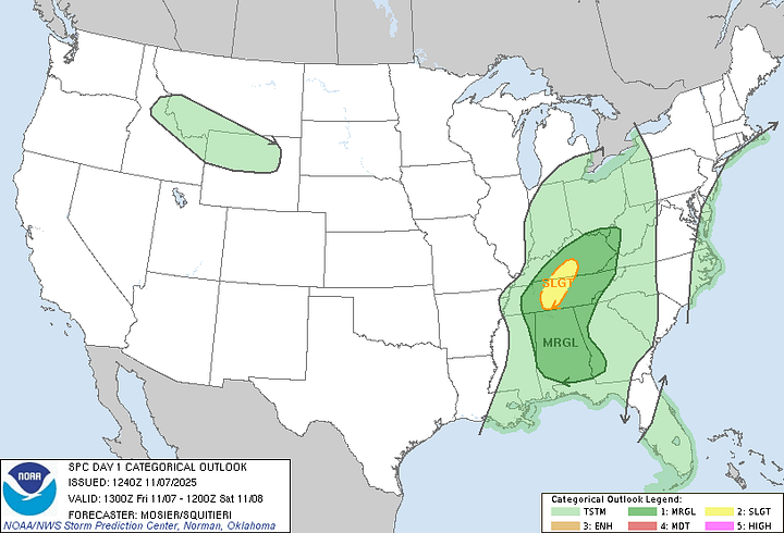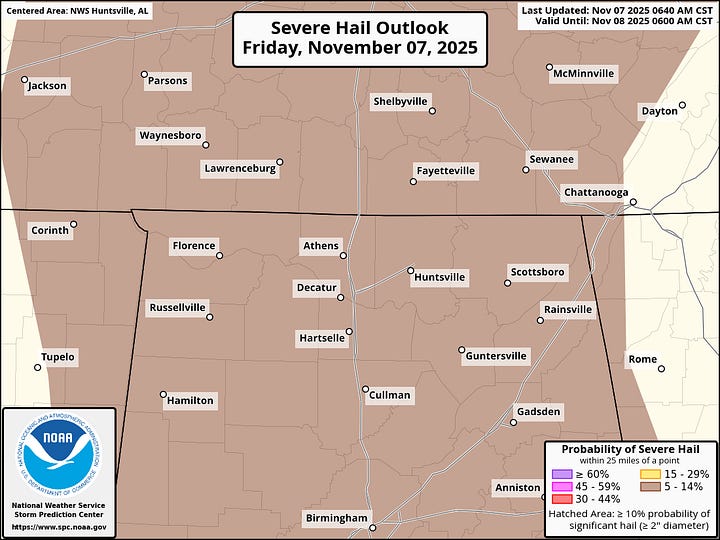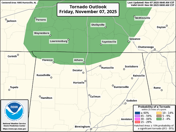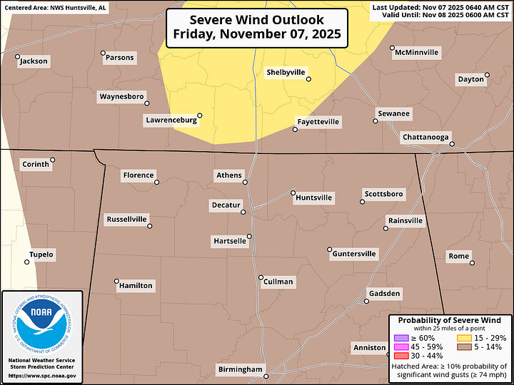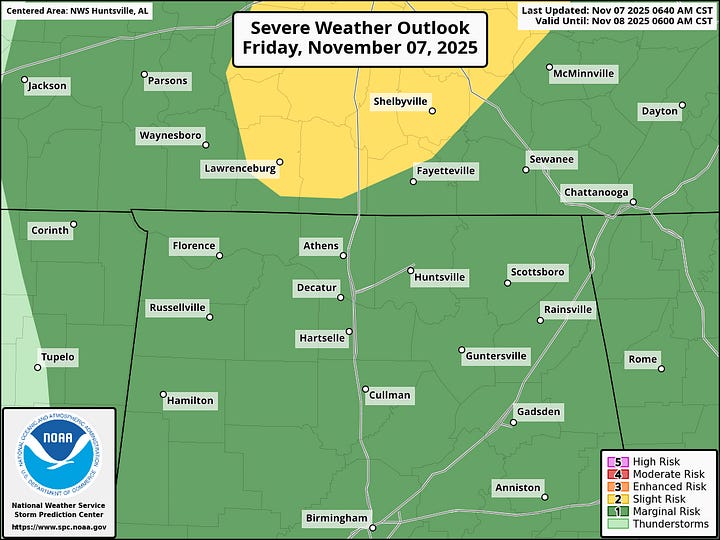 North Alabama is outlooked for a Marginal Level 1 out of 5 Risk for severe thunderstorms. A good bit of Southern Middle Tennessee is outlooked for a Slight Level 2 out of 5 Risk for severe thunderstorms.