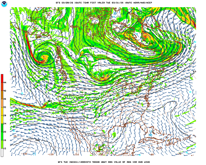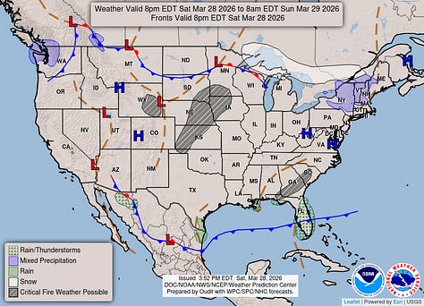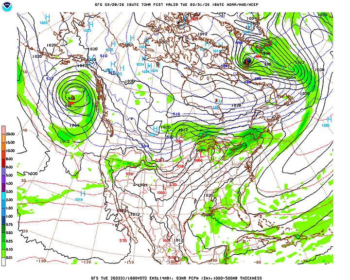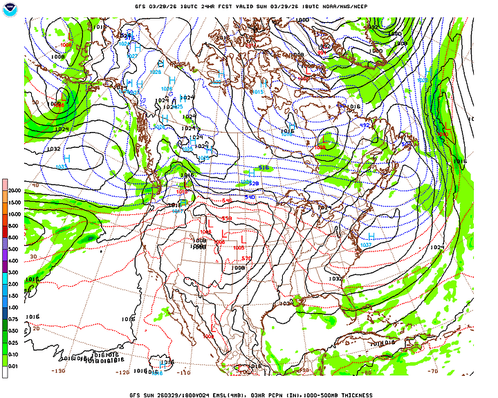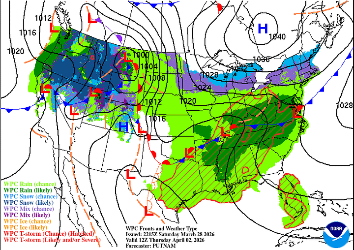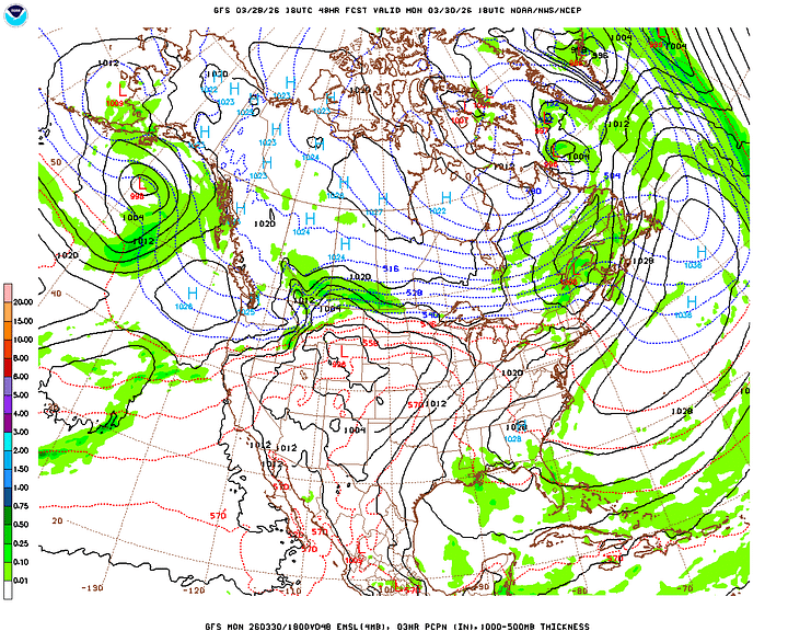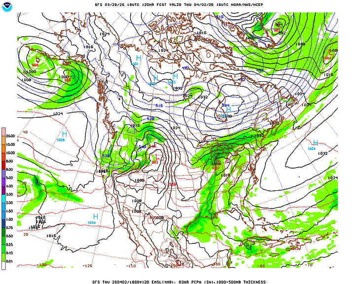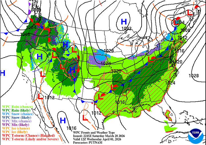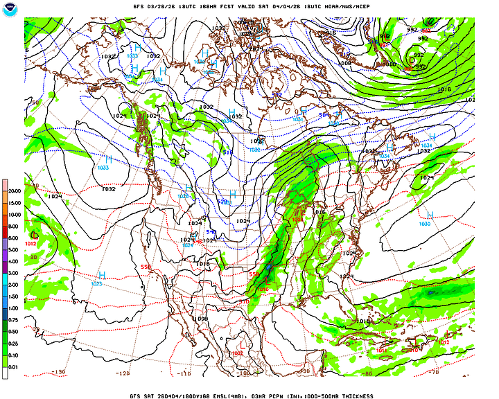 Then Wednesday, which is the first day of April, I’m trying not to let it make an April Fool out of any of us, cross-examining the global model data. And the rain chances have trended upward a bit. The Canadian is the outlier, with a slower progression of the rain along/ahead of the cold front. For now will forecast a mostly cloudy day, another breezy one, 50% chance of showers and thunderstorms. And look for a High near 80, Low in the lower 60’s.